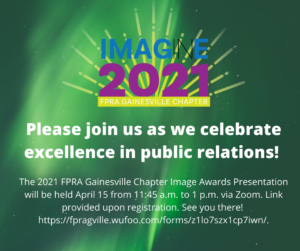 It’s finally here! Please join us for the 2021 FPRA Gainesville Chapter’s annual Image Awards presentation on April 15, to be held as part of our monthly program from 11:45 a.m. to 1 p.m. on Zoom. We look forward to celebrating excellence in public relations and our colleagues for their outstanding efforts to advance our profession in creative and exciting ways.