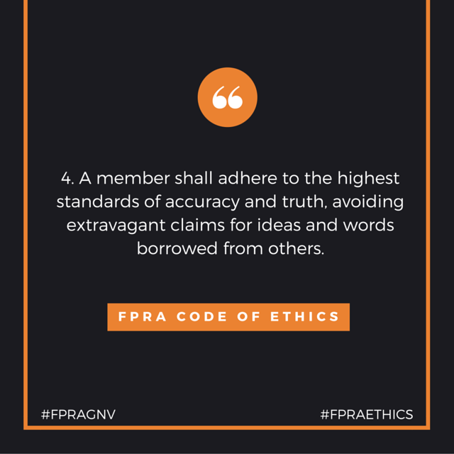 We’re on to the fourth principle of the FPRA Code of Ethics: “A member shall adhere to the highest standards of accuracy and truth, avoiding extravagant claims for ideas and words borrowed from others.”