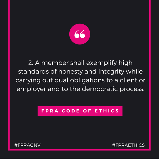 Up next in our ethics series is number two in the FPRA Code of Ethics: “A member shall exemplify high standards of honesty and integrity while carrying out dual obligations to a client or employer and to the democratic process.” What does this mean to you?