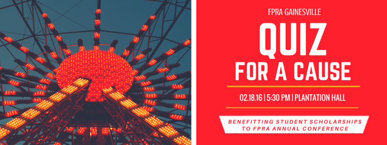 Join us at Plantation Hall at Haile Village Center Thursday, February 18 at 5:30 p.m. for Quiz for a Cause, our annual fundraiser benefitting student scholarships to FPRA’s annual conference.
