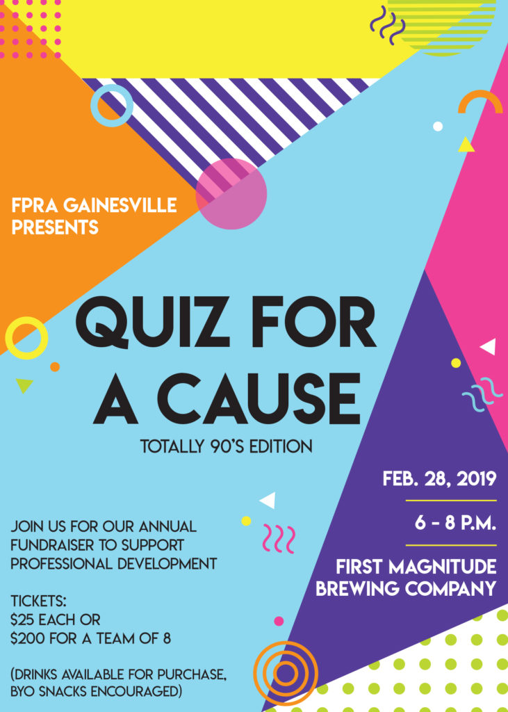 Join us for an entertaining night of trivia at Quiz for a Cause: ’90s Edition, our annual fundraiser to support professional development opportunities for FPRA members. Teams will test their knowledge of ’90s-themed trivia to compete to be the 2019 Quiz for a Cause Champions.